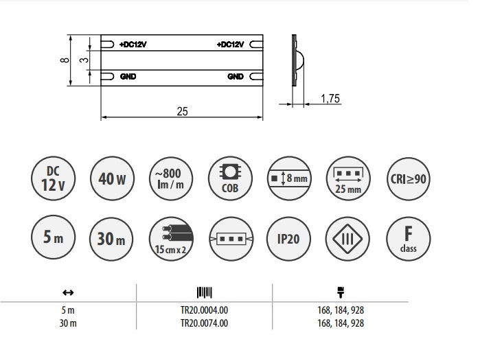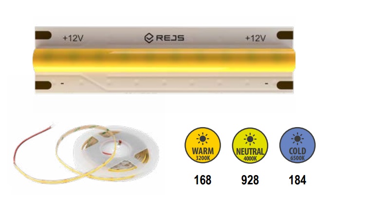 LED lenta COB, 40W IP20 8mm, 5m, 800lm, 12V, neitrāla